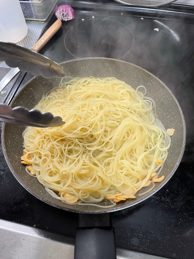 I used Angle hair pasta here because it is quick to cook, but you can use any pasta you like.